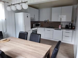 In the kitchen you will also find basic items such as coffee, tea, cooking oil, salt and sugar. The terrace, located just outside the main entrance, offers a great view of the fjord. The bathroom, which is also a laundry room, includes a bathtub, toilet, washing machine, dryer and hairdryer, as well as shampoo and conditioner. Bed linen and towels are included in the price.